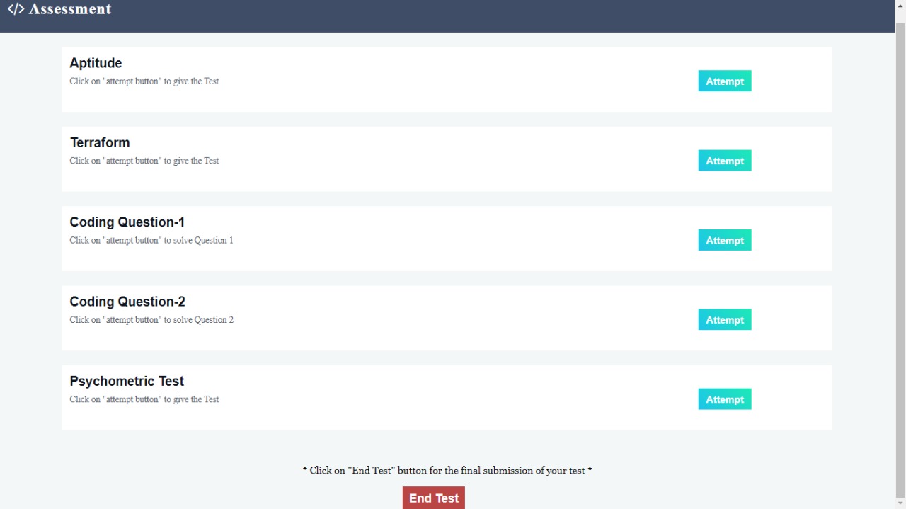 Once click on the button, a dashboard will open displaying all the questions with their particular attempt button and also timer will start as soon as you click start button.